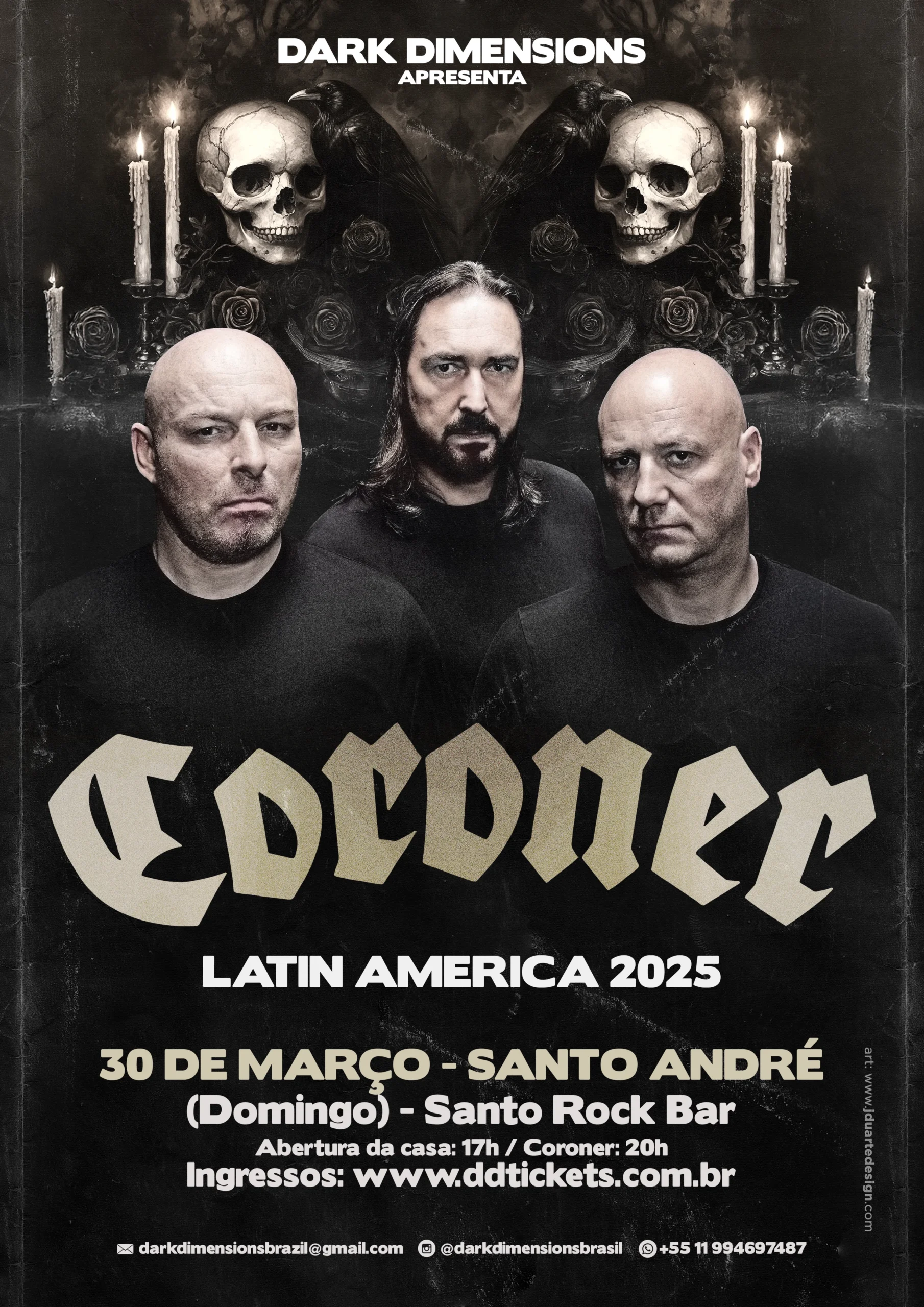 Ícone do Thrash Metal técnico mundial, a lendária banda suíça Coroner embarcará em uma extensa turnê global em 2025 para comemorar suas quatro décadas de carreira. No Brasil, o grupo realizará um show único e exclusivo no dia 30 de março, domingo, no Santo Rock Bar, em Santo André/SP, como parte de uma turnê de seis shows pela América Latina organizada pela produtora Dark Dimensions.