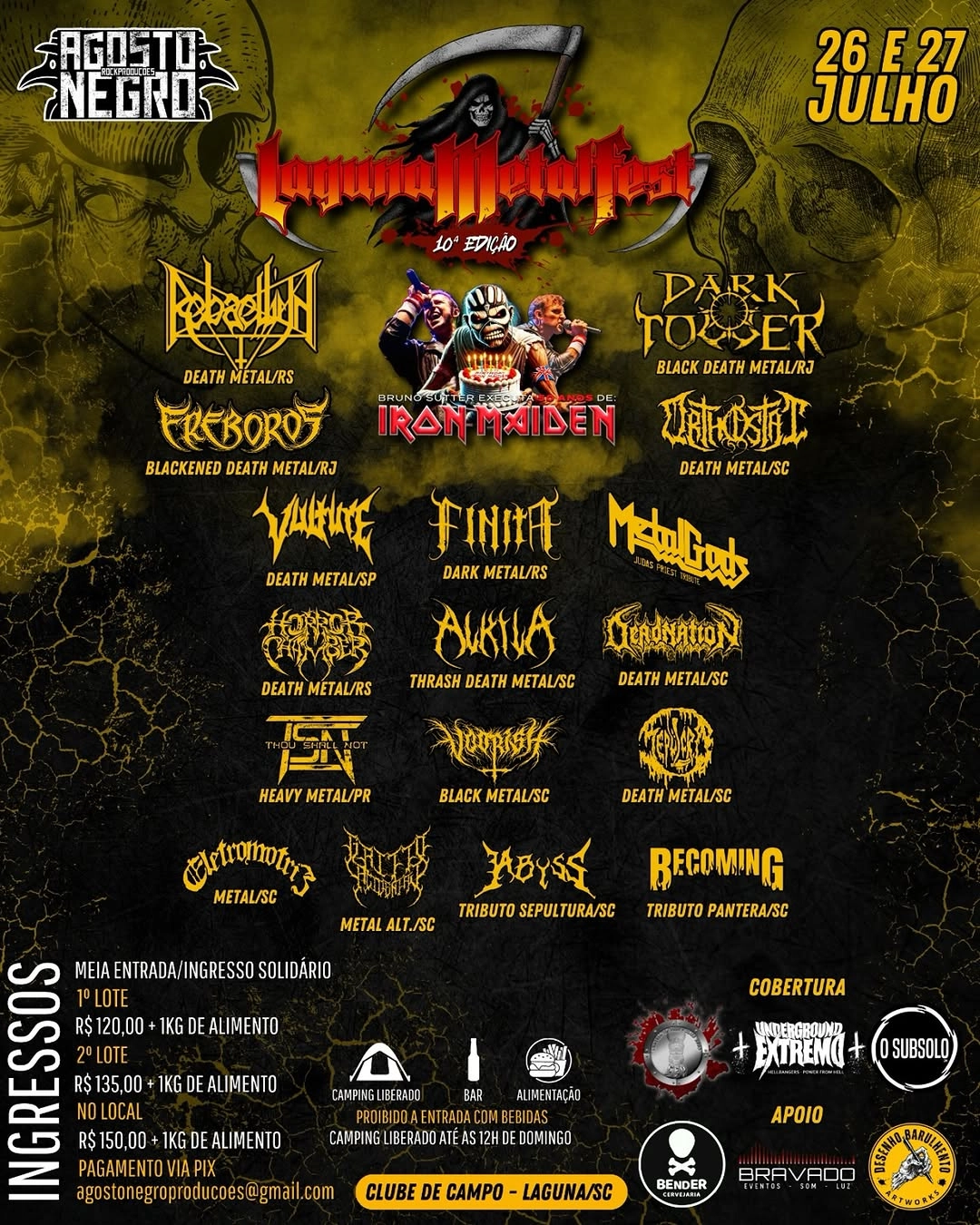 O ‘Laguna Metal Fest’, que celebra sua 10ª edição nos dias 26 e 27 de julho, acontece no tradicional Clube do Campo, em Laguna/SC, e já teve sua primeira leva de ingressos liberada ao valor promocional de R$ 120,00 + 1kg de alimento não perecível. Além do ORTHOSTAT, o line-up traz outros nomes de peso como Rebaelliun, Ereboros, Dark Tower, Bruno Sutter, Vulture e muitos outros. Confira abaixo o cartaz e o serviço completo para mais informações: