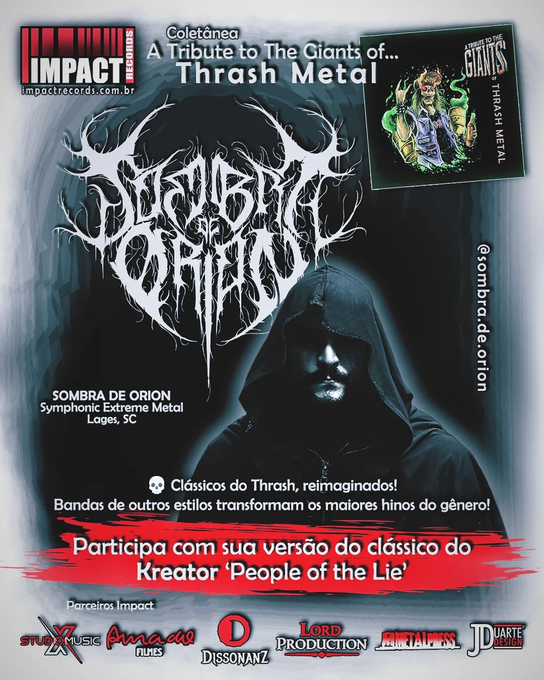 Em paralelo, o SOMBRA DE ORION foi confirmado na coletânea ‘A Tribute to The Giants of Thrash Metal’, que reunirá nomes de diversas vertentes do metal extremo para homenagear clássicos do gênero. A contribuição do projeto será uma releitura do clássico “People Of The Lie”, da lendária banda alemã Kreator. Confira a arte oficial da coletânea: