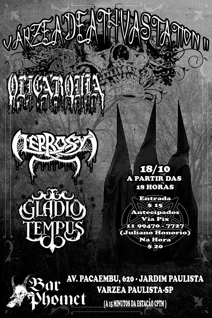 Além do lançamento do álbum, o Gladio Tempus também divulgou os primeiros detalhes de sua turnê nacional. A banda se apresentará ao lado da lendária Leprosy no evento ‘Várzea ‘Death’vastation II’, que acontecerá no dia 18 de outubro de 2025, no Bar’Phomet, em Várzea Paulista/SP. O evento contará ainda com a participação dos paulistas do Oligarquia. Confira abaixo o cartaz e serviço completo para mais informações: